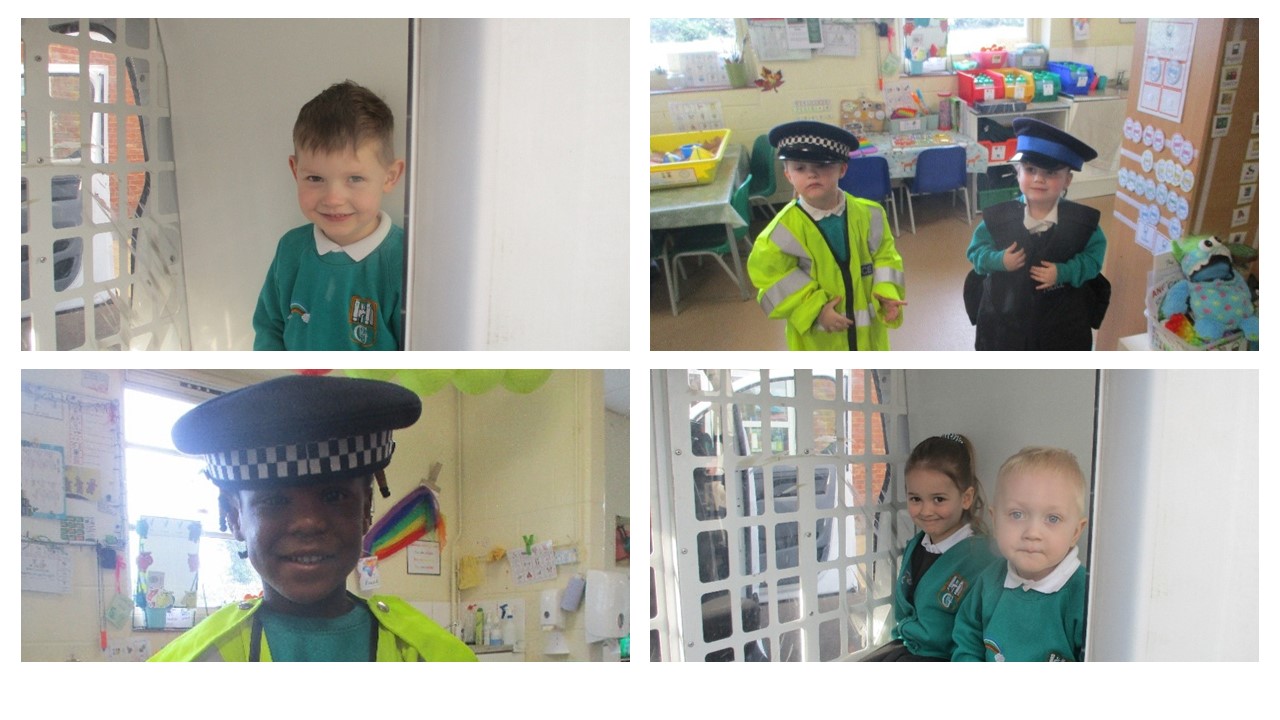 The Police came to visit us and talk to us about how they help to keep us safe. We tried on their uniform and some of us even sat in the back of the Police van!
